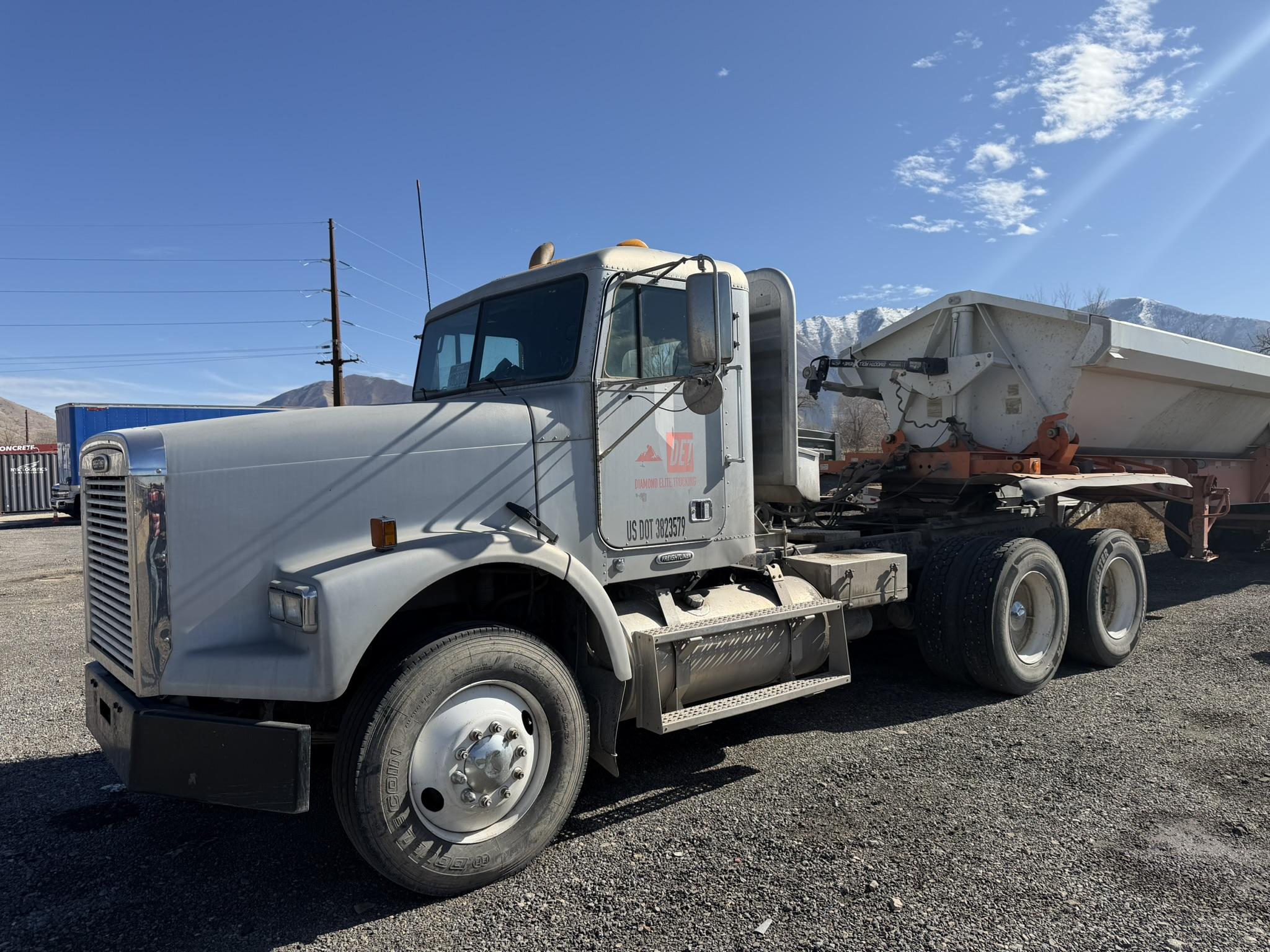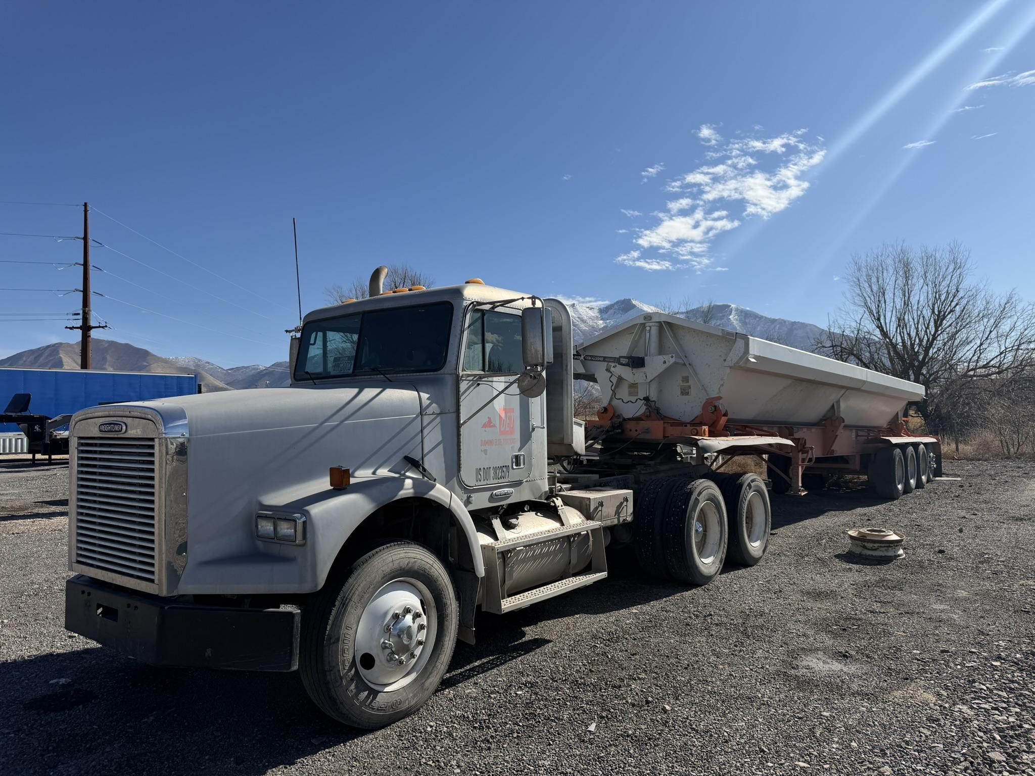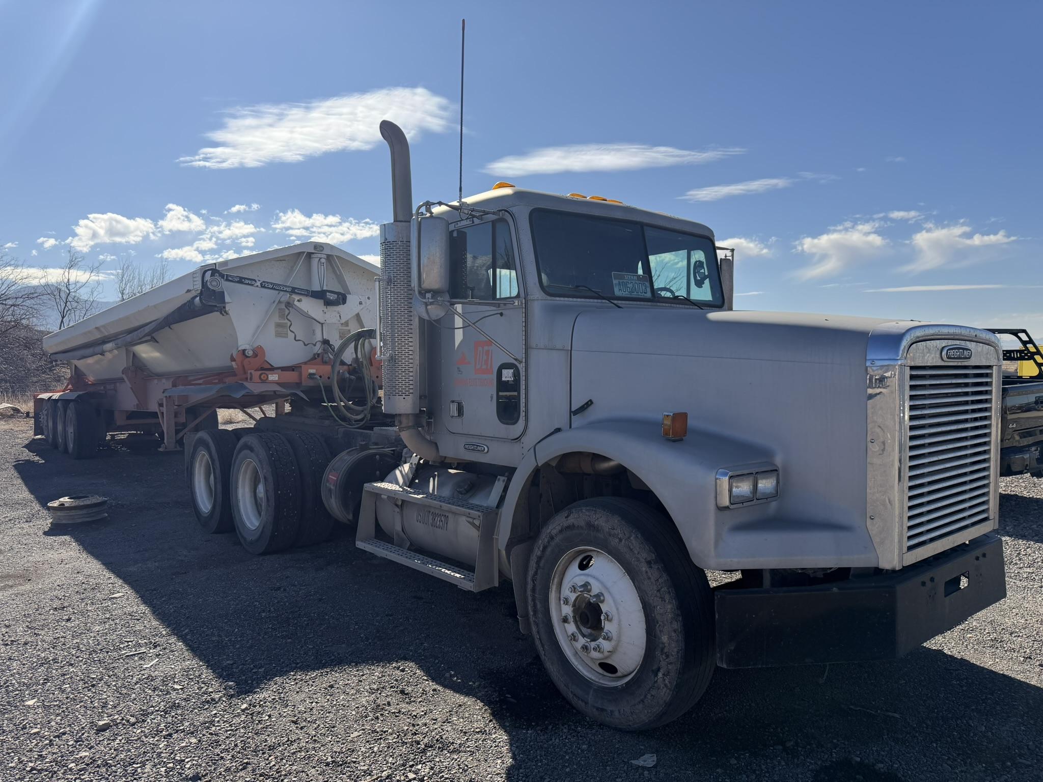 NICE 2001 FREIGHTLINER MODEL FL120 DAY CAB TRUCK AND A SWEET 2019 DEMCO MODEL CR444-AR-RLS-3424 4 AXLE SIDE DUMP TRAILER
