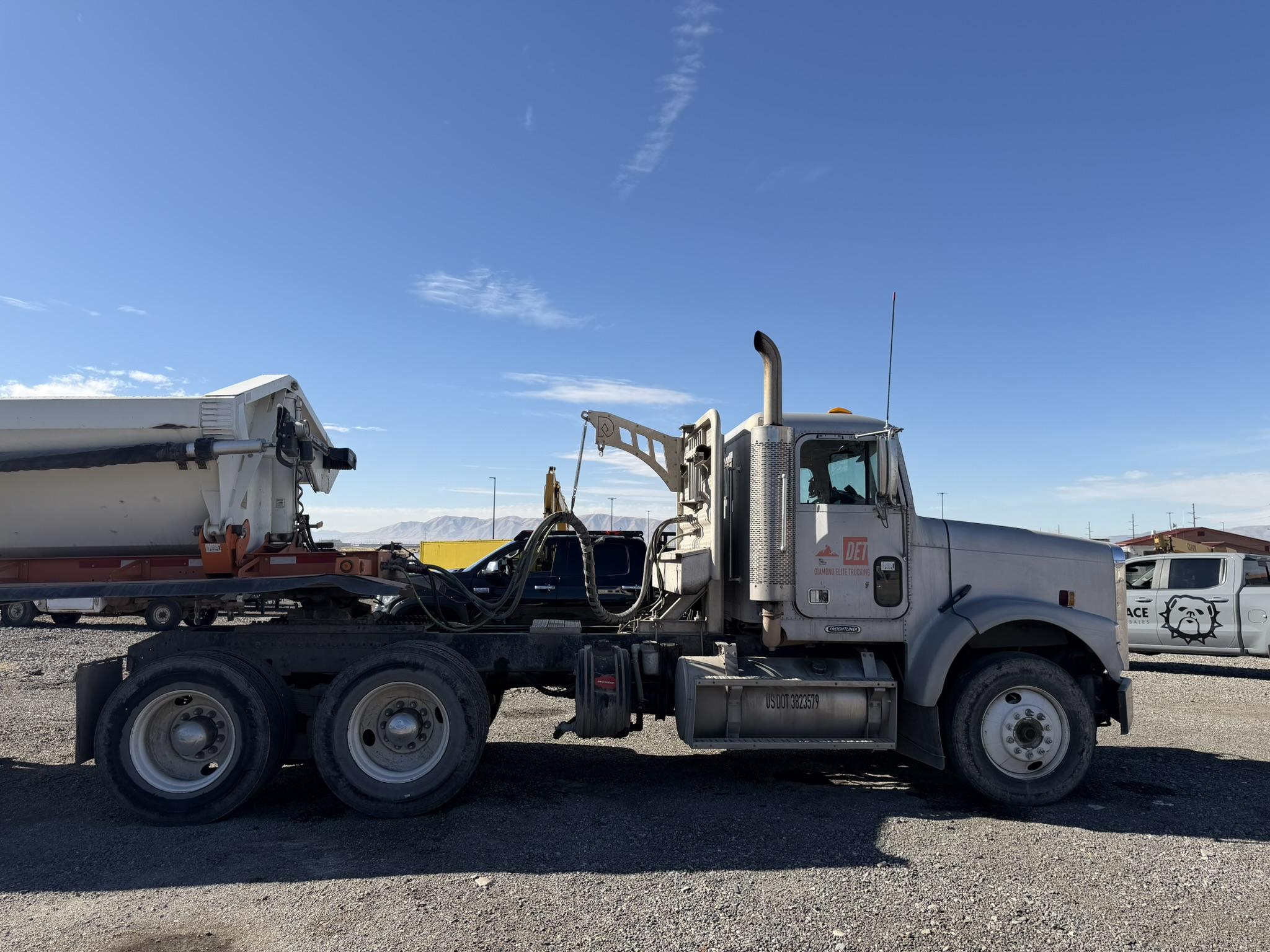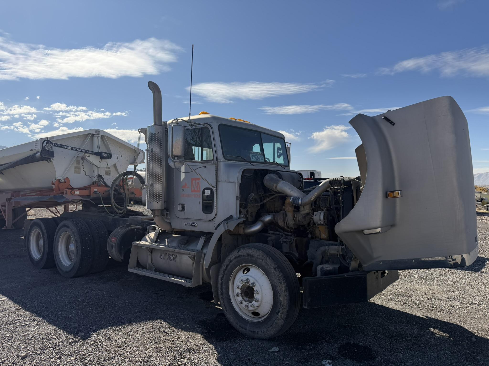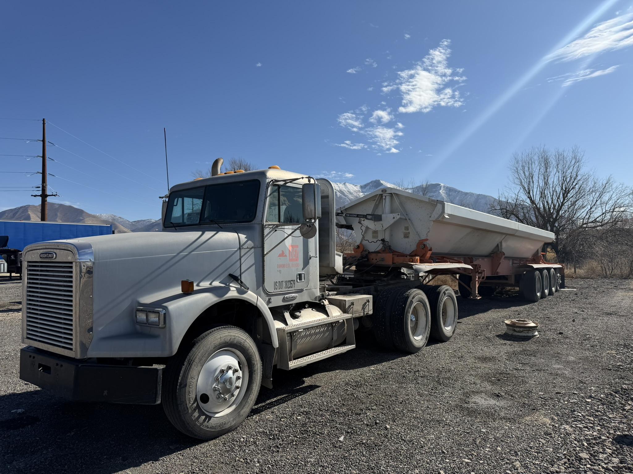 NICE 2001 FREIGHTLINER MODEL FL120 DAY CAB TRUCK AND A SWEET 2019 DEMCO MODEL CR444-AR-RLS-3424 4 AXLE SIDE DUMP TRAILER