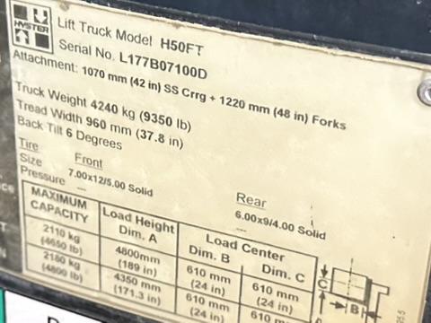 CLEAN 2008 HYSTER MODEL H50 FT FORTIS 5,000 POUND FORKLIFT